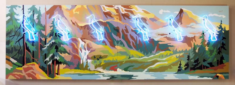 Bluebird Mountain (2020), neon, wood, acrylic/latex paint, 48 x 144 x 6 (coll. Delta Airlines, Salt Lake City Airport)
